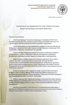 „Ze zdumieniem i niedowierzaniem przyjąłem informację dotyczącą decyzji Pana Rektora WUM o nieprzedłużeniu współpracy z Panem Profesorem Mirosławem Wielgosiem w charakterze Kierownika Katedry i Kliniki Położnictwa WUM w Warszawie. Decyzja wbrew opinii społeczności akademickiej, Rady Wydziału i Komisji powołanej przez Pana Rektora budzi sprzeciw i niepokój co do zasad demokracji panujących na uczelniach wyższych. Pan Profesor Wielgoś jest wybitnym, powszechnie rozpoznawalnym i zasłużonym położnikiem o ogromnym dorobku naukowym i organizacyjnym, niekłamanym autorytetem w środowisku ginekologów i położników nie tylko w Polsce ale i na świecie. Ośrodek i zespół, który stworzył prowadząc diagnostykę i terapię płodu były oparciem dla pracy lekarzy położników całej Polski, a brak tej placówki w dotychczasowym wymiarze odbije się na poziomie opieki perinatalnej w naszym kraju. Pozbawienie Pana Profesora możliwości pracy na zajmowanym dotychczas stanowisku to ogromna krzywda, strata dla naszego środowiska i społeczeństwa a co jeszcze bardziej dziwi w tej decyzji – strata dla WUM. W imieniu zespołu Kliniki Perinatologii i Chorób Kobiecych UM im. Karola Marcinkowskiego w Poznaniu gorąco popieram list otwarty członków Prezydium PTGiP.„